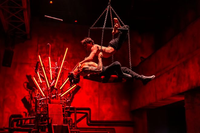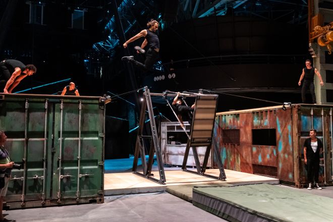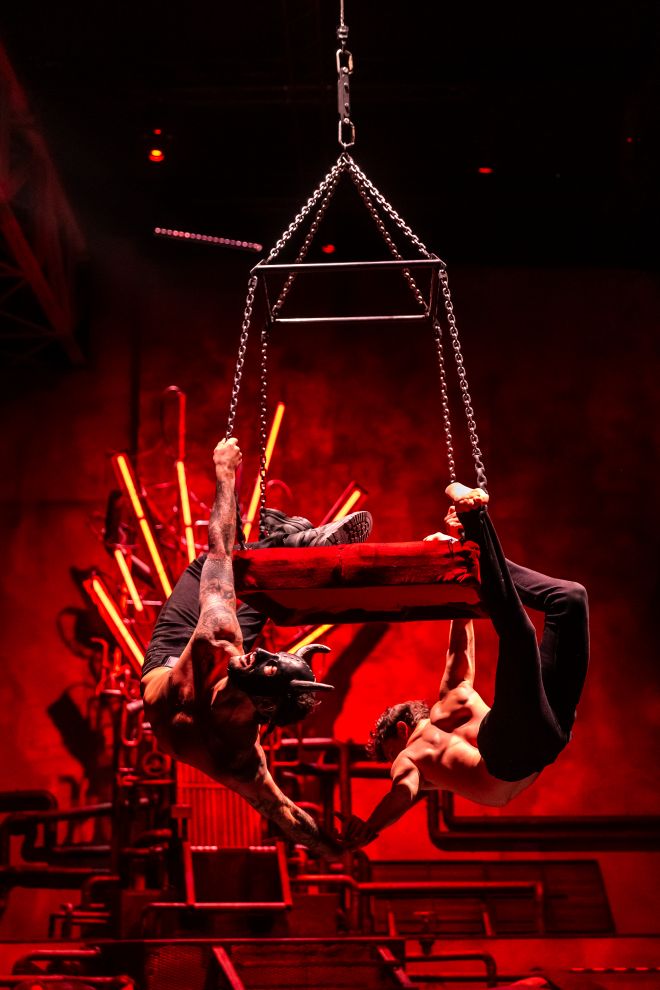 Az egész estés előadás során nemcsak sokféle levegős számban, hanem a földön és még egy vizes medencében játszódó jelenetben is láthatjuk az előadóművészeket. Összesen több mint húsz cirkuszi szám és számos különleges táncműfaj is szerepel a koreográfiában. A két és fél órás, kétszáznál is több jelenetből álló produkció a 32 szereplő számára is komoly kihívást jelent: a művészek egyenként több mint másfél órát aktívan játszanak, és egy-egy előadó akár 4-5 cirkuszi, illetve tánc zsánerben is dolgozik az előadásban.